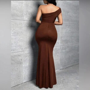 🆕Slayr Elegant Solid Color Asymmetric Collar High Slit Maxi Fishtail Dress M🆕