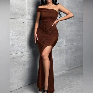 🆕Slayr Elegant Solid Color Asymmetric Collar High Slit Maxi Fishtail Dress M🆕