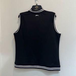 Slazenger Bomber Style Golf Vest new with tags size XL. This is a great golfing vest. It has two pockets in the front. It is black and white. There is a full zipper closure in the front. The measurement flat from pit to pit is approximately 22 inches and in length 25 inches. I am open to offers. Bundle and save.