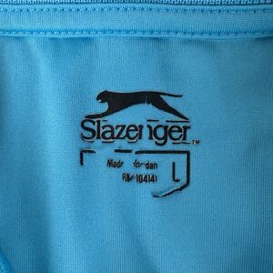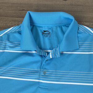 Description: Slazenger Polo Shirt Mens Large Blue White Striped Golf Short Sleeve Stretch