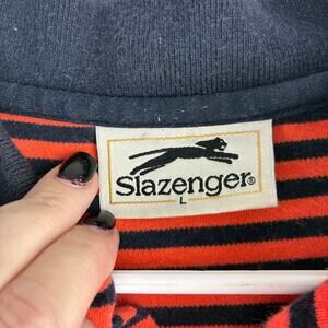 Slazenger Short Sleeve Polo Shirt Mens Large Orange Navy Blue Stripe Golf Casual