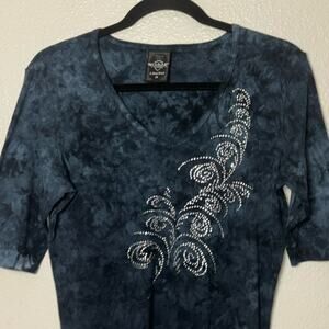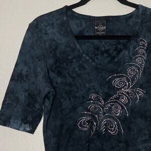 Sledge Shirt Women's Size Medium Y2K Vintage Scoop Neck Navy Blue, Black Silver rhinestones