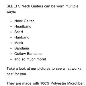 Sleefs neck gaitors - a collection of 7. Wear as a scarf, headband, face covering, get creative! One mermaid kitty design specifically kid sized the rest youth/adult. Like new