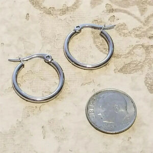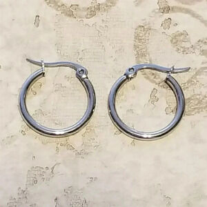 Sleek silver 304 grade stainless steel earrings in classic round hoop shape measure 20mm in height.