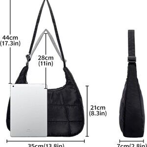 Features: This stylish quilted tote easily switches from a crossbody to a hobo, offering a roomy, lightweight option for shopping, work, or casual outings. Crafted from durable, soft nylon, it’s built for everyday use. The adjustable straps promise a comfortable fit, and its modern crescent shape adds a fashionable touch.