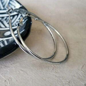 Sleek Art Deco Pattern Silver Tone Round Hoop Earrings 40mm 1.6" Long Leverback