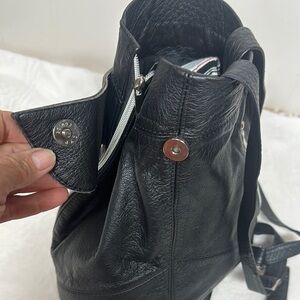 This black backpack combines a sleek design with practical functionality, featuring a vertical zipper for easy access. Its structured shape and durable material make it a versatile choice for everyday use. See all photos as they are part of description