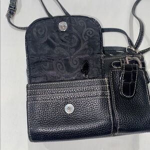 This stylish black crossbody bag is crafted from leather-like material and features a main zippered compartment for secure storage. The sleek design is complemented by silver-toned metal hardware, making it a practical choice for everyday use.