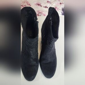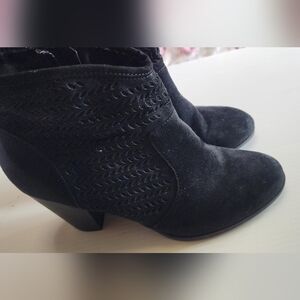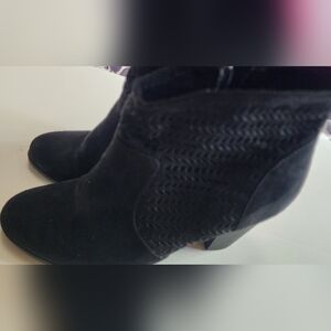 These black heeled boots feature a stylish textured pattern on a soft suede-like material, offering a modern and sophisticated look. The block heel provides stability, while the pointed toe adds a touch of elegance. Perfect for elevating any outfit with their clean and contemporary design.