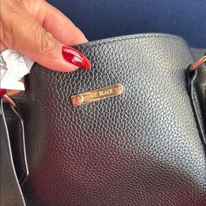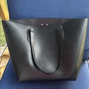 This elegant black tote bag boasts a structured silhouette and a smooth, matte leather finish. Its spacious interior and minimalist design make it an ideal choice for both work and shopping. The subtle metallic accents add a touch of sophistication to its clean lines.