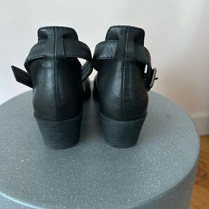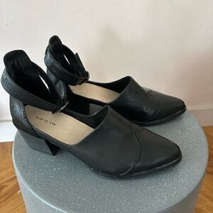 These black mules boast a sleek, minimalist design with a pointed toe and flat sole, crafted from smooth leather-like material. The slip-on style offers a clean, professional look, ideal for both casual and formal occasions. The uniform black color adds a touch of elegance with a subtle sheen.