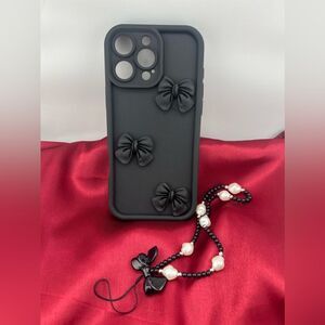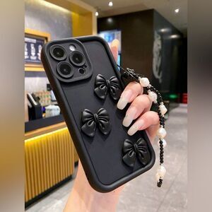 Add a touch of sophistication and modern elegance to your iPhone 16 Pro Max with this matte black case featuring 3D bow accents and a chic pearl and bead strap. Perfect for fashion-forward individuals who value both style and functionality.