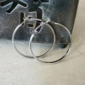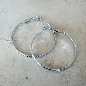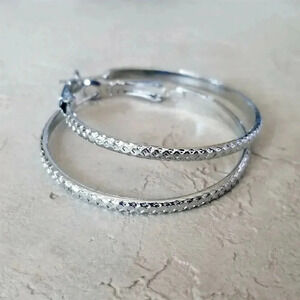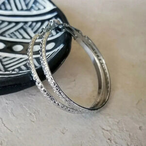 Sleek Geometric Pattern Silver Tone Round Hoop Earrings 40mm 1.6" Long Leverback