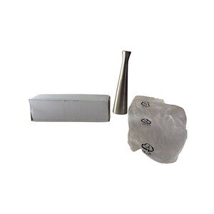 Elegant minimalist stainless steel vase designed with a slender silhouette and brushed metallic finish. Offers contemporary home decor accent with clean lines and sophisticated aesthetic for displaying single stems or minimal floral arrangements. Box may show wear.