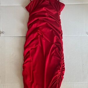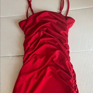 Figure-flattering red mini dress with ruched side detailing and adjustable spaghetti straps. Smooth, satin-like finish gives a polished look for evening plans or parties. Designed to highlight the silhouette with comfortable stretch and a bold red color.