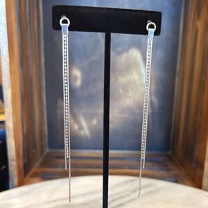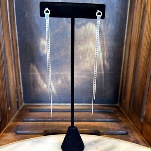 Silver plate chain drop earrings on post. Lovely silver chain earrings made of the different type and length silver (at least plated I cannot remember if they are pure). The longest chain measures a bit over 4” and they are set on posts. These are a great simple piece to add to your outfit for a super sleek look. These date to the early 2000’s