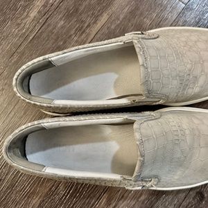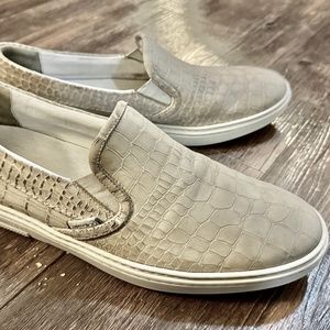 The shoes in the image are slip-on sneakers with a luxurious aesthetic. They feature a textured upper that resembles crocodile skin, suggesting a faux crocodile embossment, which gives them a high-end, fashion-forward look. The color is a neutral taupe or light beige, versatile for coordinating with a variety of outfits and suitable for both casual and smart-casual wear.
