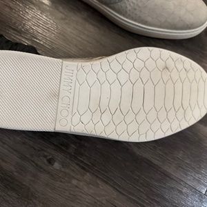These slip-ons have a smooth, rounded toe and elasticated side panels which are characteristic of slip-on sneakers, ensuring a snug fit and ease of putting on and taking off. The sole is white, creating a subtle contrast with the taupe upper and adding to the contemporary feel of the shoes. The craftsmanship suggests designer quality, and the small label visible on the side indicates a branded shoe, which in the context of the title you've provided, would be Jimmy Choo—a brand known for its stylish and high-quality footwear. The wooden floor provides a rustic backdrop that contrasts with the shoes, highlighting their smooth texture and refined appearance. These shoes seem to blend comfort with luxury, making them a suitable choice for someone who values both style and practicality in their footwear. The overall design does not compromise on elegance, while the build reflects a relaxed slip-on style. These sneakers could serve well for various occasions, from a casual day out.