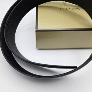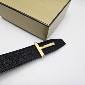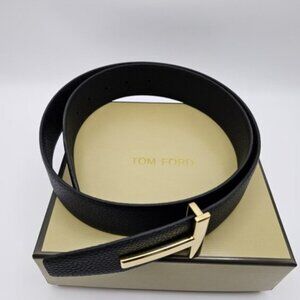 Elegant black leather belt with signature gold “T” hardware. Excellent overall appearance. Comes with matching box