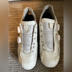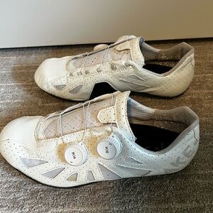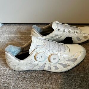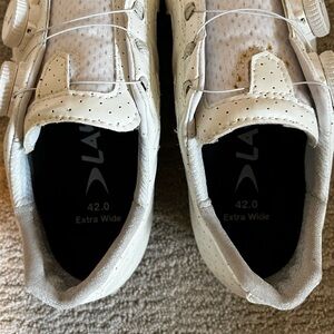 Elevate your cycling experience with these sleek white athletic shoes. Designed for comfort and performance. Selling a new pair of Lake Cycling CX302 shoes. Men’s size 9.5 (EU 42) extra wide. Only worn once to try on. Minor blue stain on inside of shoe and small brown dots on tongue (as shown in photos). I no longer have the shoe box, so they come without the original box.