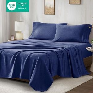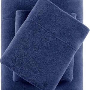 Micro Fleece Sheet Set - Full by Sleep Philosophy A luxurious alternative to flannel, the Micro Fleece Sheet Set turns your bed into a cozy getaway. This ultra-soft micro fleece sheet set is perfect for staying warm and comfortable through the night. Made from 100% polyester, this sheet set fits up to a 16" mattress and is machine washable for easy care. Available in a variety of colors and patterns, each sheet set includes: 1 Fitted Sheet, 1 Flat Sheet, and 2 Pillowcases or 1 Pillowcase for Twin sizes. 100% Polyester Solid Sheet Set Full: 82x96"/54x75+14"/20x30" 2 Primary Color: Navy 100% polyester solid Micro Fleece 180gsm Includes: 1 Flat Sheet 1 Fitted Sheet 2 Pillowcases.