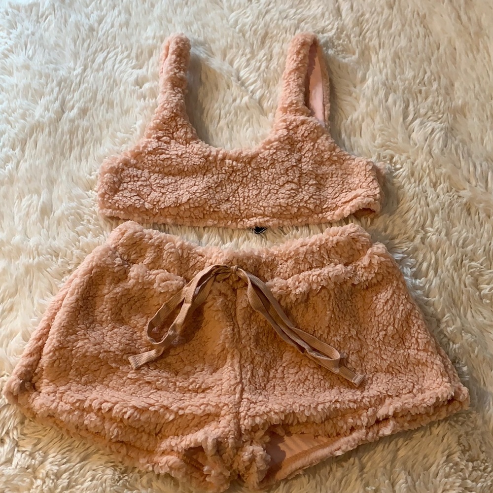 Blush colored, teddy bear style shorts and bra top set
