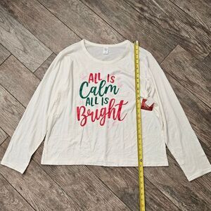White (off-white) long sleeve crew neck shirt with All Is Calm All Is Bright written in green and red on the front