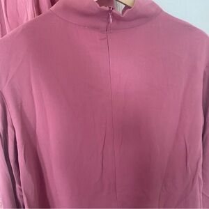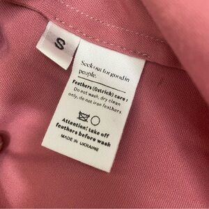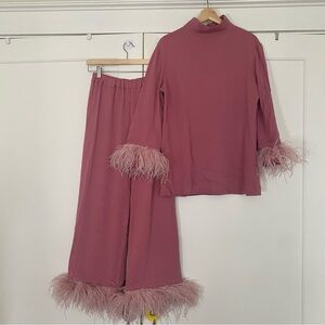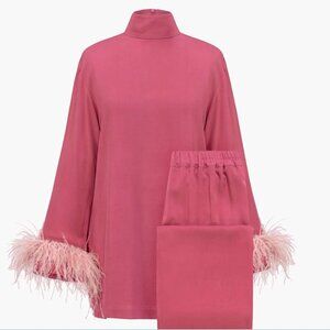 Light burgundy pajama shirt and pants set in soft, lightweight certified viscose with a matte effect. The classic top features a high mock neck with a concealed tonal zip at the back, while the gently-cropped pants have a comfortable elastic waist. Trimmed with detachable ostrich feathers, it offers a smooth transition from soirée to slumber.