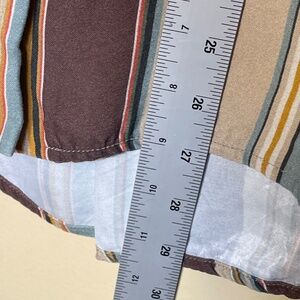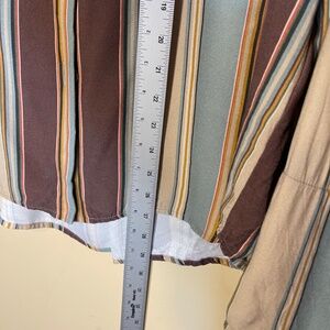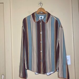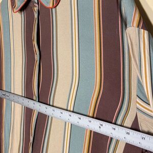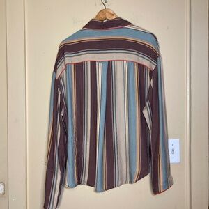 Stylish button-up top with multicolor stripes. Features a classic collar and long sleeves. Perfect for casual wear.