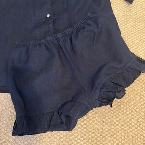 Chic navy pajama set with ruffle details. Button-up top and matching shorts. Comfortable and stylish for lounging. Great condition. Non smoking home.