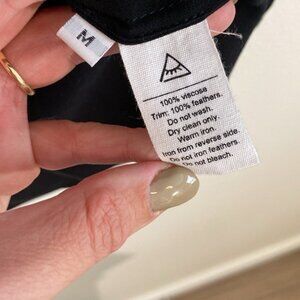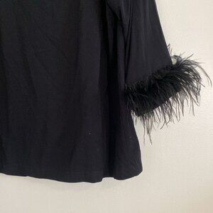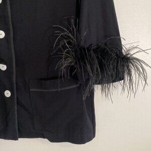The signature SLEEPER party pajamas continue to be our best-selling style. A relaxed pajama shirt set are cut from soft black certified viscose, trimmed with a double layer of detachable ostrich feather cuffs. The shirt features a cropped sleeve length, as well as tonal piping at the rounded collar, button closure and pockets.