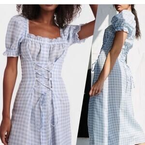 Sleeper Women's Blue Vichy Marquise Corset Linen Dress Gingham Midi Lace Up S
