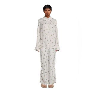 Elegant pajama set with floral print. Button-up top with collar. Relaxed fit pants. Soft and comfortable fabric.