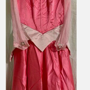 Dreamy, floor length Princess Aurora Sleeping Beauty inspired gown in vibrant pink with a dramatic white collar and pointed peplum. Sheer mesh sleeves finish with sparkly snow-star appliqués at the cuffs. The bodice has a corset-style lace-up back for an adjustable fit, and the full skirt is trimmed with lace at the hem—perfect for Halloween, Disneybound, Dapper Day, or cosplay photos.