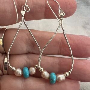 ❤️ Sleeping Beauty Turquoise Fresh Water Pearl 925 Liquid Silver Dangle Earrings
