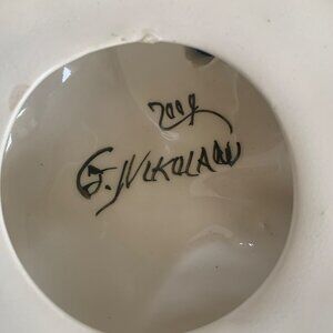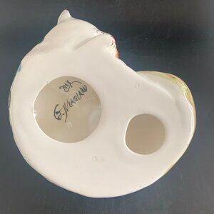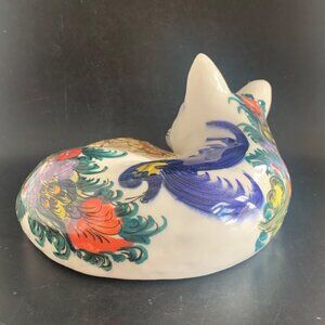 Sleeping Cat Porcelain Hand Painted Colorful Florals and Bird Signed 2004