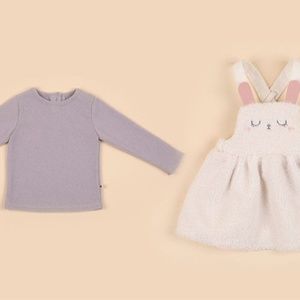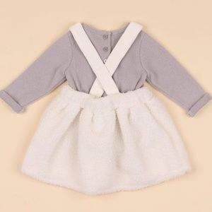 This set includes a basic purple hue button back shirt and a pretty lamb overall skirt.