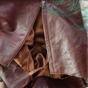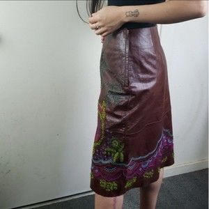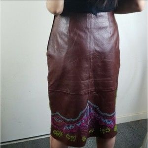 Redish brown leather skirt, embroidered, lined, invisible side zipper. In excellent condition, no flaws.