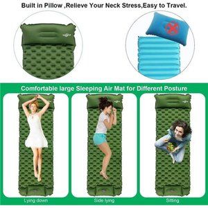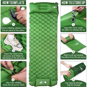 🧿【Foot Press to Inflate-Only 20s Needed】 There is no need to inflate with your hands, mouth, or a pump for our camping sleeping pad. It just only takes 20s after you inflate the sleeping mat fully by stamping the spot of the built-in pump with your foot.With anti-leakage films in the valves, you would never worry about air leaking when using it! Besides, super quick to deflate - take out the deflation plug.It's time to plan a camping and hiking with our innovative camping sleeping pad now!