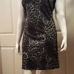 Animal print dress. Sleeveless. Knit fabric. Great when paired with a blazer & boots.