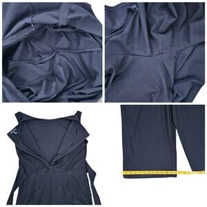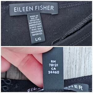 Lightweight stretch crepe fabric in solid black. One piece jumpsuit romper w/ rear zip closure. Round neck, unlined. Sleeveless, attached belted tie at waist, wide cropped length legs. The tie can be tied in front or back. Excellent preowned condition. Fabric Content & care labels have been removed. Size Large by Eileen Fisher.