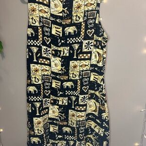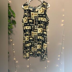 Stylish sleeveless dress with a unique black and gold pattern. Perfect for any occasion.