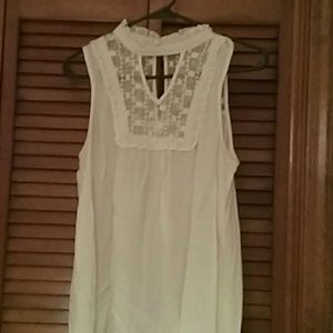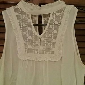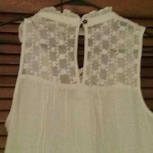 💐🌹Beautiful dainty and delicate sleeveless blouse that buttons around neck and can be worn tucked in pants or worn out. Beautiful lace pattern on upper chest and upper back. Only been worn once has no stains or damage at all and color is more of an ivory /off-white. Gorgeous casual wear with jeans also beautifully appropriate as work apparel.🌹💐