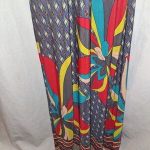 This elegant sundress is designed with a sleeveless cut and spaghetti straps, ideal for resort wear. The dress features a striking blue and red tropical motif, flowing gracefully in a maxi length for a casual yet chic look. pit to pit size is 13.5 " top of shoulder to bottom hem is 64" bundle more items for bigger deals Bin-141