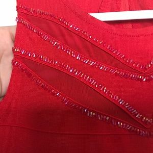 Beautiful red bodycon mini dress | Beaded and mesh detail across chest | Mesh detail along back | Back zipper | Gorgeous thick material, fits so good and really accentuates your curves | NWT Never worn