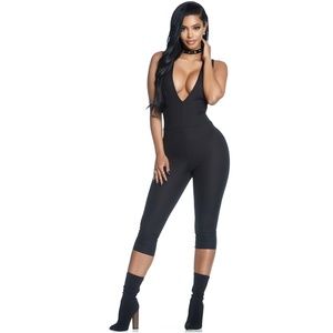 Sleeveless capri jumpsuit with plunging V neckline and back zipper closure. Choker sold separately. NWT. Black. 96% Polyester/4% Spandex. Great for holiday parties, New Year's Eve, special occasions, dance, club wear and more!