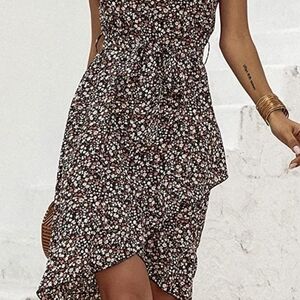 Sleeveless Halter Belted A-line Dress Floral Wrap Hem Belted Halter Dress slip