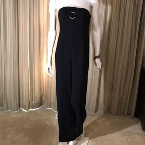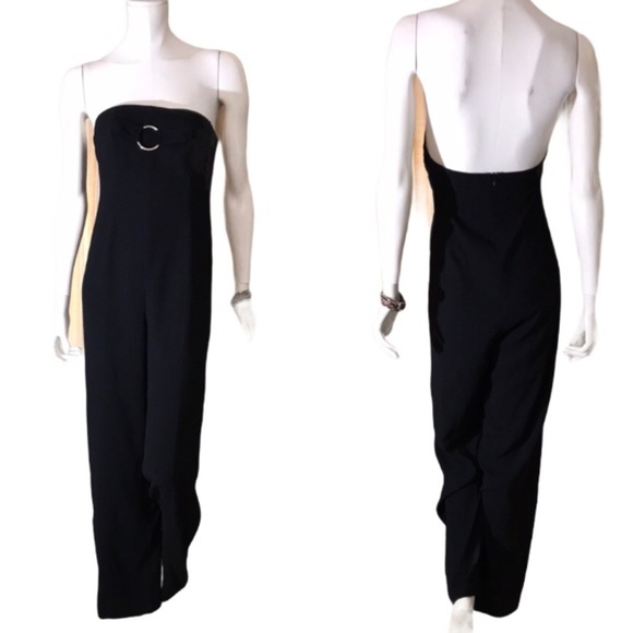 Black sleeveless jumper with silver ring accent by Forever 21 Contemporary. Silicone edge to help keep top in place. Wide legs, back zip.