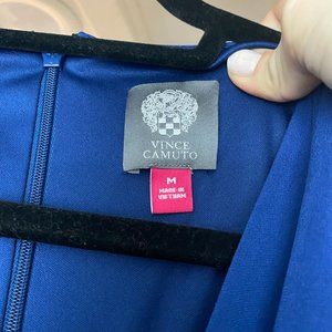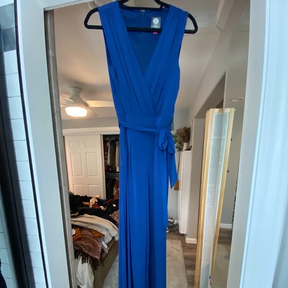 Royal Blue. Back zip closure. Solid. 2 side pockets. Lined. Very soft and slinky but not too thin. 95% polyester, 5% spandex. Wide leg. Surplice v neckline.