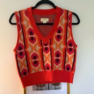 Stylish sleeveless knit top with a bold geometric pattern. Features vibrant red, pink, and orange colors.